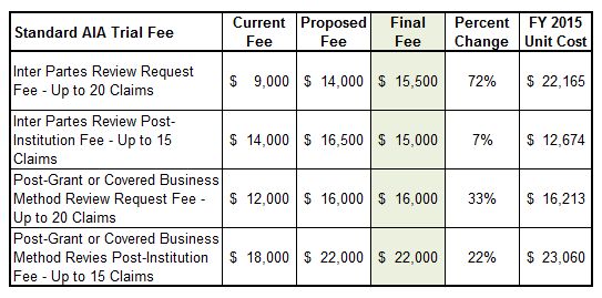 The final rule regarding these fees generally tracks the fees the Patent Office proposed in its notice of proposed rulemaking published in October of 2016 (discussed here). The final rule makes no changes to the standard fees the Patent Office proposed for post grant and covered business method patent reviews. The final rule changes, however, the standard fees the Patent Office proposed for inter partes review "to more closely align fees and costs to the Office for performing these services." Id. at 52790. Relative to the standard fees the Patent Office proposed for inter partes review, the aggregate amount of the two fees ($30,500) remains the same, but the Office will receive $1,500 more for each inter partes review petition the PTAB denies.