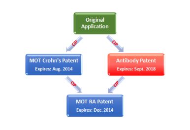 Instead of filing identical versions of its original application, designated as divisionals, the applicant filed two applications, each a continuation-in-part (CIP) of the original application. These CIP applications included all sorts of additional information, none of which was necessary to describe the inventions of the antibody and method claims. One of the CIP applications eventually issued as the antibody patent after ten years of examination comprising years of the applicant's delays in prosecuting that application. The antibody patent also included two claims reciting an invention not described in the original application. The other application, on the method of treating (MOT) Crohn's disease, issued more quickly. A yet later CIP of these two applications eventually issued as a patent with claims reciting a method of treating rheumatoid arthritis. These patents do not share a common expiration date. Their relationship is shown below.