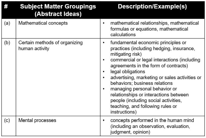 The below table lists the three subject matter groupings, together with descriptions and examples as provided by the 2019 Guidance. The three subject matter groupings (and their respective examples and descriptions) are based on Supreme Court and Federal Circuit precedent that "synthesize[] key concepts identified by the courts as abstract ideas." 2019 Guidance at 52.