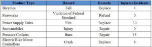Hazards: Fire/Burn/Shock (8); Injury (4); Crash (3); Fall (2); Laceration (1); Choke (1); Entrapment (1); Violation of Federal Standard (1); Explosion (1)