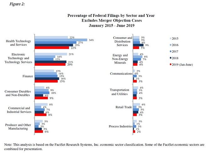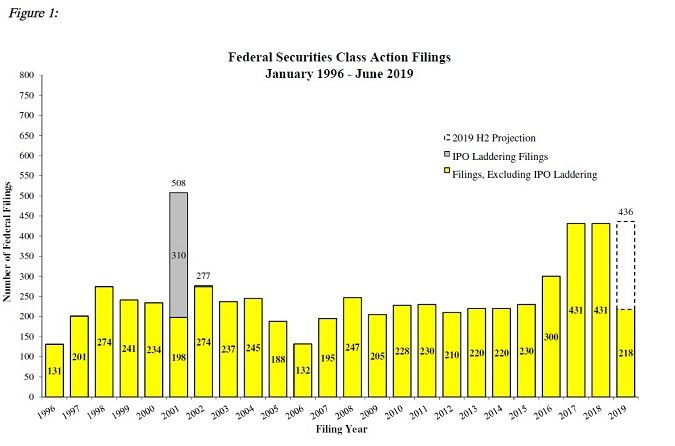 Figure 1 below reflects filing rates for the first half of 2019 (all charts courtesy of NERA). So far this year, 218 cases have been filed in federal court, annualizing to 436 cases, which is on pace with the number of filings in 2017 and 2018, and significantly higher than the numbers seen in years prior to 2017. Note that this figure does not include the many class suits filed in state courts or the rising number of state court derivative suits, including many such suits filed in the Delaware Court of Chancery.