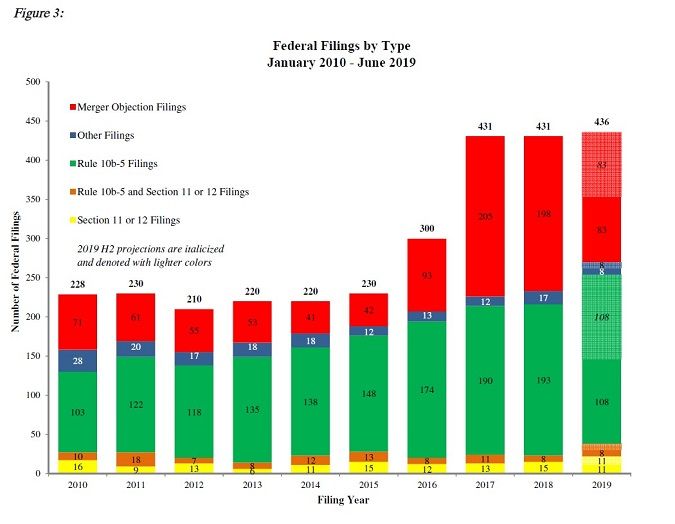 As shown in Figure 3, 83 "merger objection" cases have been filed in federal court in the first half of 2019 —below the pace of 109 cases at this point in 2018. If the 2019 trend continues, the 166 merger objection cases projected to be filed in 2019 will be about 16% fewer than the 198 merger objection cases filed in the prior year.