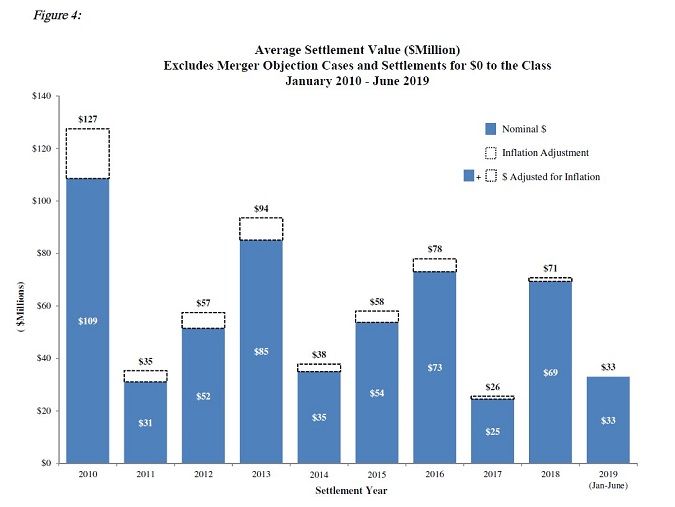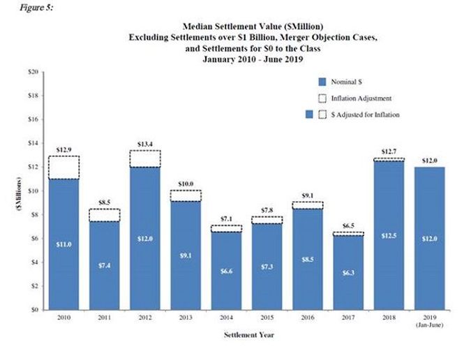 Finally, as Figure 5 shows, the median settlement value for cases was $12 million, which is in line with the median in 2018 and almost double the median value in 2017.