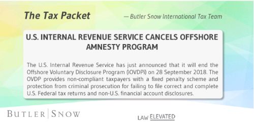 The U.S. Internal Revenue Service has just announced that it will end the Offshore Voluntary Disclosure Program ("OVDP") on 28 September 2018. The OVDP provides non-compliant taxpayers with a fixed penalty scheme and protection from criminal prosecution for failing to file correct and complete U.S. Federal tax returns and non-U.S. financial account disclosures (typically referred to as "foreign bank account reports" or "FBARs"). Taxpayers who have any concerns about their U.S. Federal tax payment or reporting obligations should contact a U.S. international tax professional immediately to discuss potential disclosure options and deadlines.