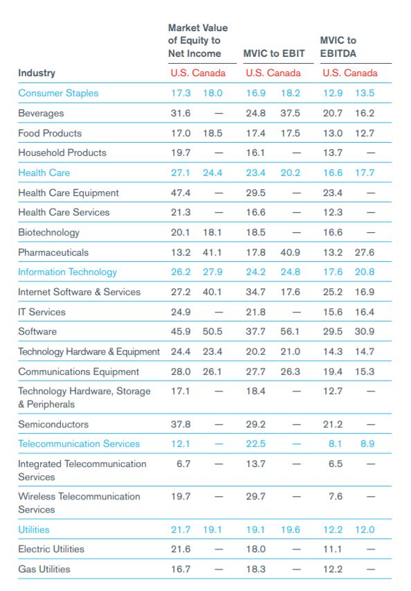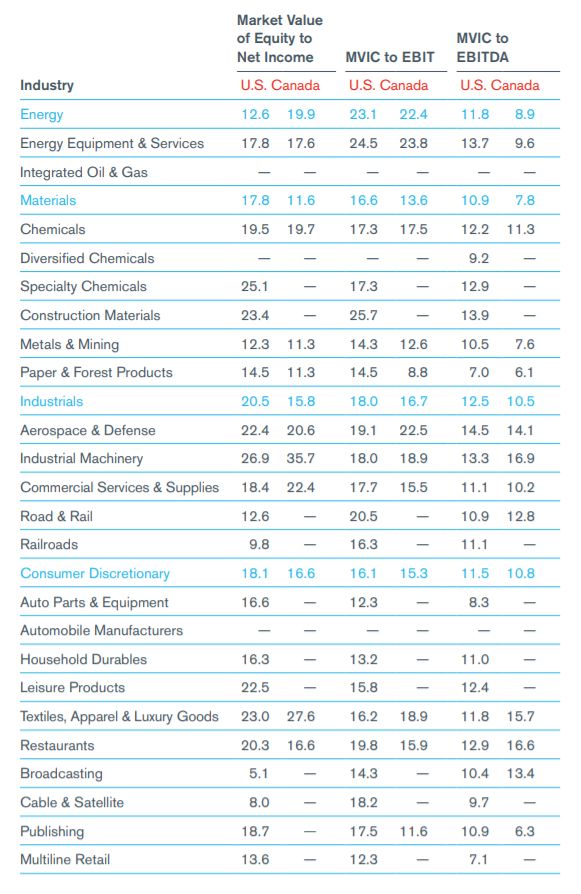 For all reported multiples in the U.S. and Canada, the average number of companies in the calculation sample was 76 (U.S.), and 29 (Canada); the median number of companies in the calculation sample was 37 (U.S.), and 12 (Canada). Sample set includes publicly-traded companies (private companies are not included). Source: Data derived from Standard & Poor's Capital IQ databases. Reported multiples are median ratios (excluding negatives or certain outliers). MVIC = Market Value of Invested Capital = Market Value of Equity plus Book Value of Debt. EBIT = Earnings Before Interest and Taxes for latest 12 months. EBITDA = Earnings Before Interest, Taxes, Depreciation and Amortization for latest 12 months. Note that due to the exclusion of negative multiples from the analysis, the number of companies used in the computation of each of the three reported multiples across the same industry may differ, which may occasionally result in a counterintuitive relationship between those multiples (e.g. the MVIC-to-EBITDA multiple may exceed MVIC to EBIT).