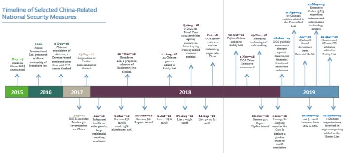 Distinct from trade disputes of past administrations, President Trump has broadly mobilized the U.S. government to counter this perceived national security threat from China. Multiple government departments and agencies have taken or are considering a range of actions, including: