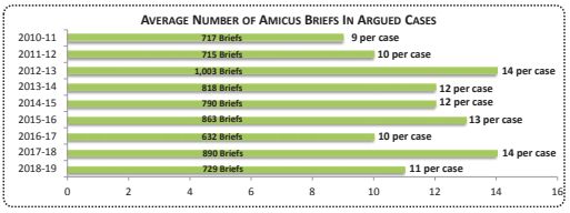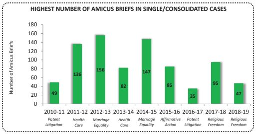 Similarly, there was a drop in the highest number of amicus briefs filed in a single or consolidated case. "Cases with 30 or more amicus briefs are no longer particularly rare, and the highest-profile cases see amicus filing reaching the triple digits." Aaron-Andrew P. Bruhl and Adam Feldman, "Separating the Amicus Wheat From Chaff," 106 Geo. L. J. Online 135, 135 (2017). In 2018–19, amici did not approach triple digits, with the top case having only 47 briefs.