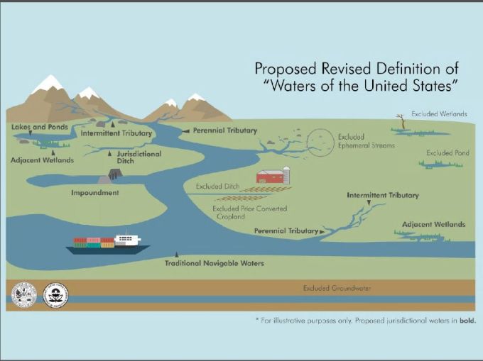 Under the proposal, traditional navigable waters, tributaries to those waters, certain ditches, certain lakes and ponds, impoundments of jurisdictional waters, and wetlands adjacent to jurisdictional waters would be federally regulated. The proposal also details what are not WOTUS, such as "features that only contain water during or in response to rainfall (e.g., ephemeral features); groundwater; many ditches, including most roadside or farm ditches; prior converted cropland; storm water control features; and waste treatment systems."
