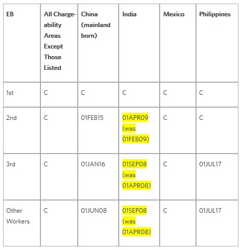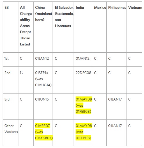 Cutoff dates for EB-3 China will remain at January 1, 2016. Cutoff dates for China "other workers" will remain at June 1, 2008. Cutoff dates for EB-3 India and India "other workers" will advance by five months to September 1, 2008. Cutoff dates for EB-3 Philippines and Philippines "other workers" will remain at July 1, 2017.
